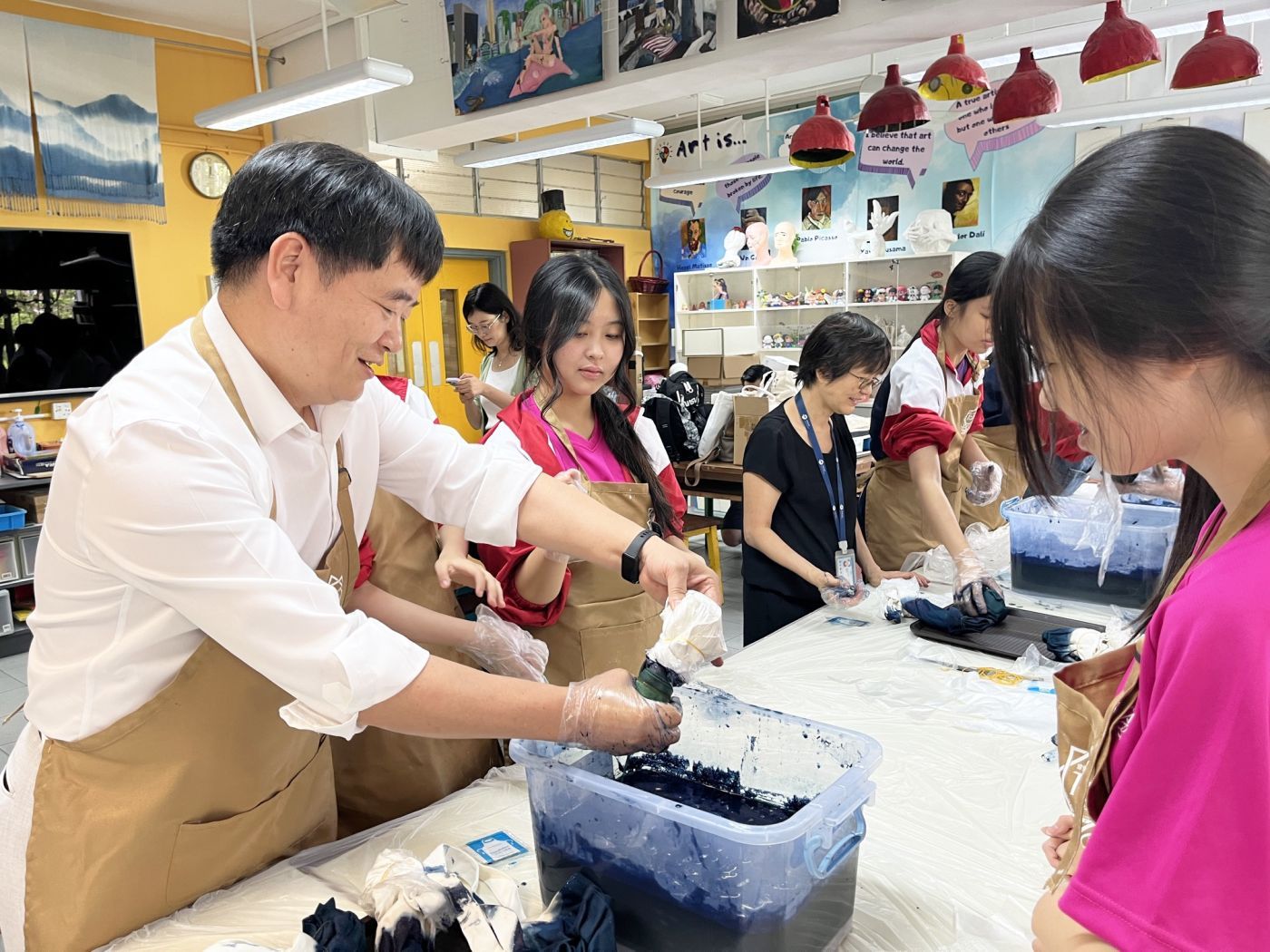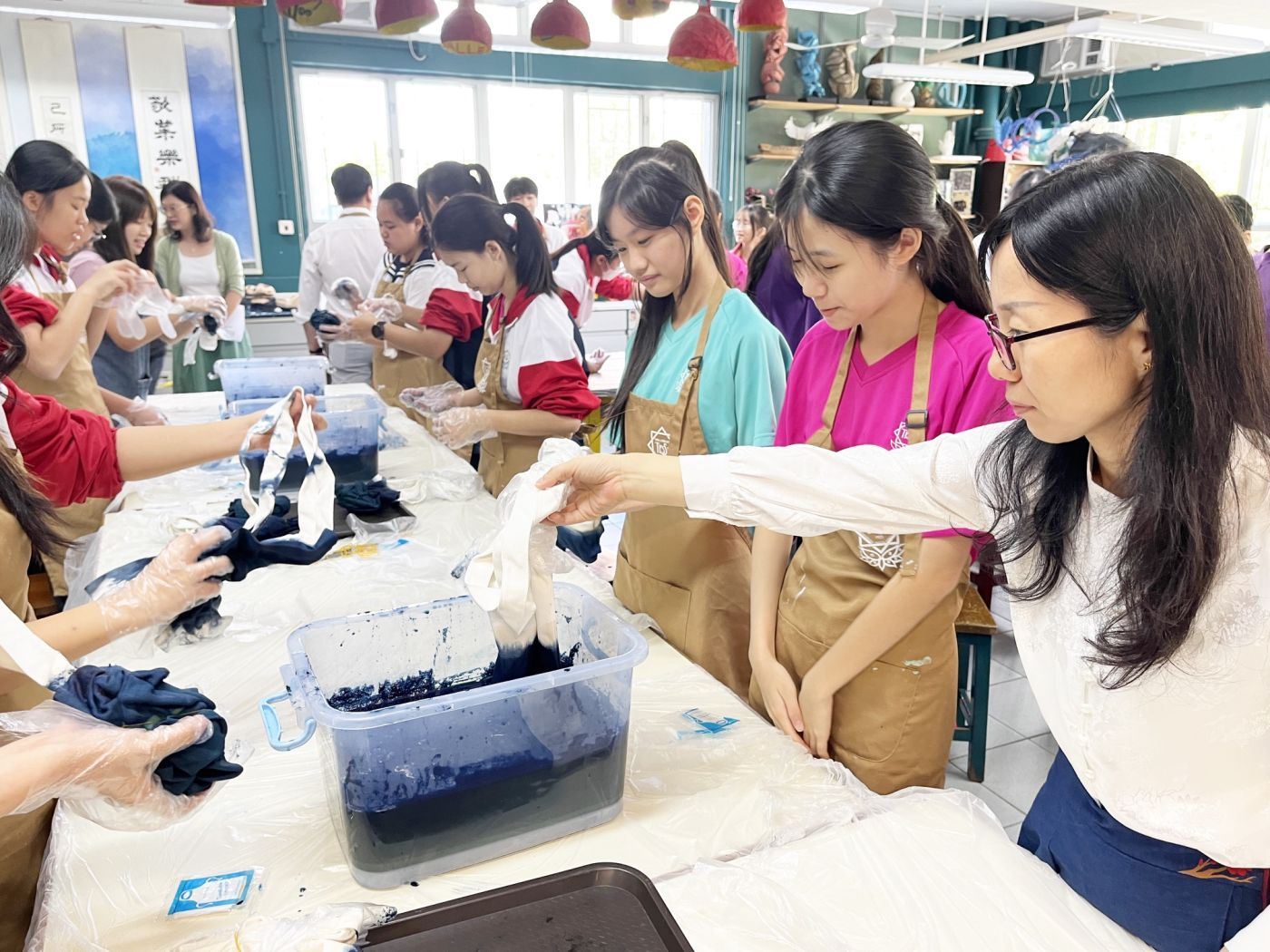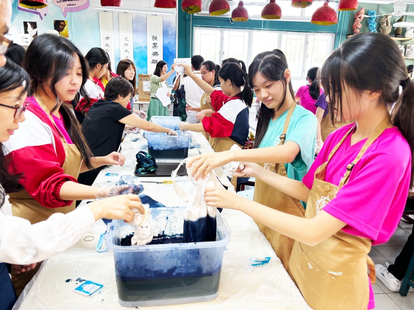 The art of Dongtou Blue, a unique traditional craft of weaving and dyeing, remains one of the last surviving forms in the Hakka region of Guangdong. This craft employs natural plant-based dyes and is produced through intricate processes, showcasing not only the exquisite nature of traditional craftsmanship but also embodying profound cultural significance. The "Dongtou Blue: Hakka Traditional Dyeing and Weaving Workshop," organized by the Federation of Hong Kong Guangdong Community Organisations in collaboration with the General Association of Hong Kong Heyuan Societies and the Hong Kong Community and Construction Association, provided students from our school with the opportunity to create their own indigo-dyed works, allowing them to experience the distinct charm of this ancient skill.