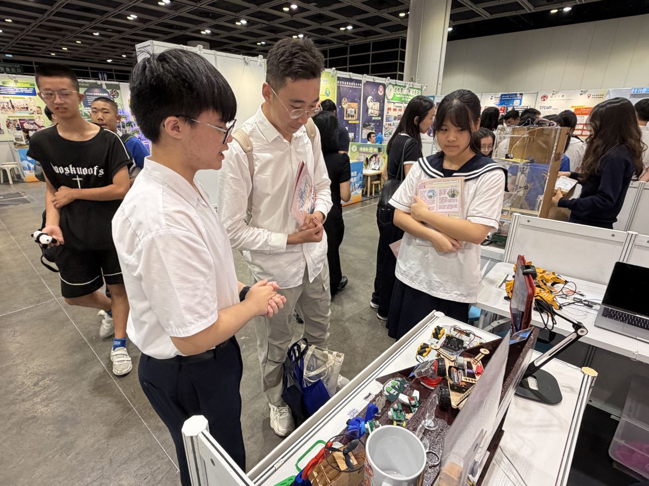 現場反應熱烈,本校攤位吸引眾多來賓到訪,包括家長、中小學生、大專院校教師及科創企業代表。來賓不僅深入了解本校STEAM教學方案,更積極參與問答遊戲,並體驗近距離與機械狗互動的樂趣。